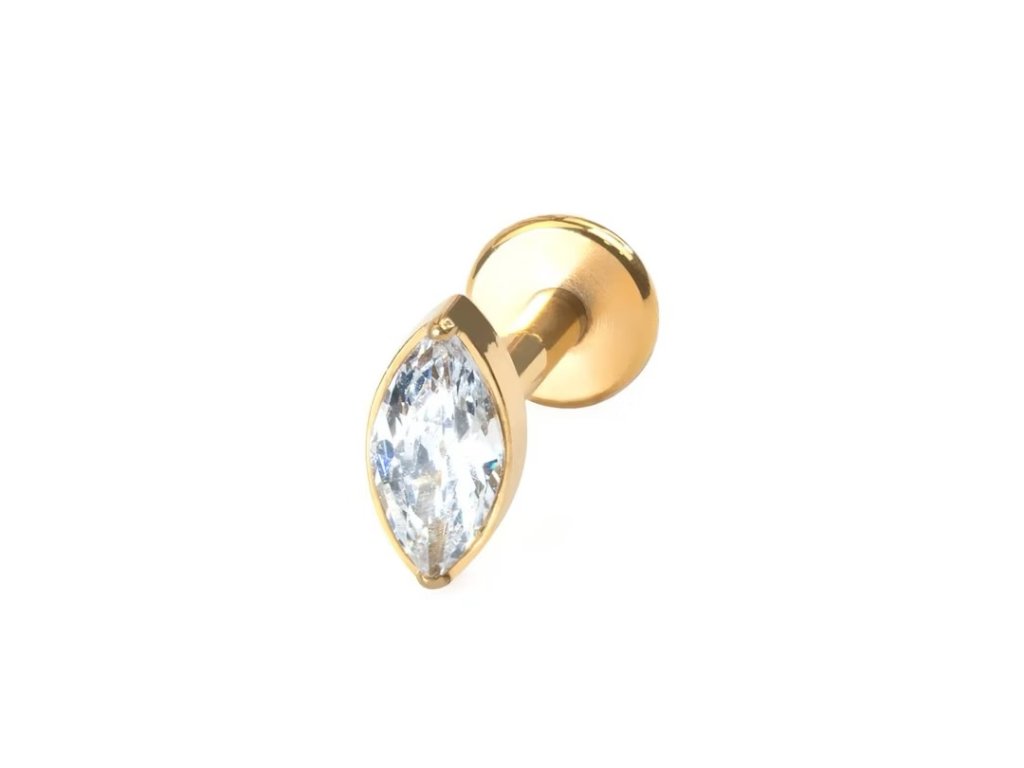 Tato klasická titanová labreta je osazená krystalickým zirkonem v markýzovém brusu. Je vybavená vnitřním závitem, což znamená, že při nasazování stačí hladkou tyčinku prostrčit piercingem a zašroubovat do ní horní část. Tento nadčasový design se skvěle hodí k piercingu do chrupavky, lalůčku a nebo do rtu.