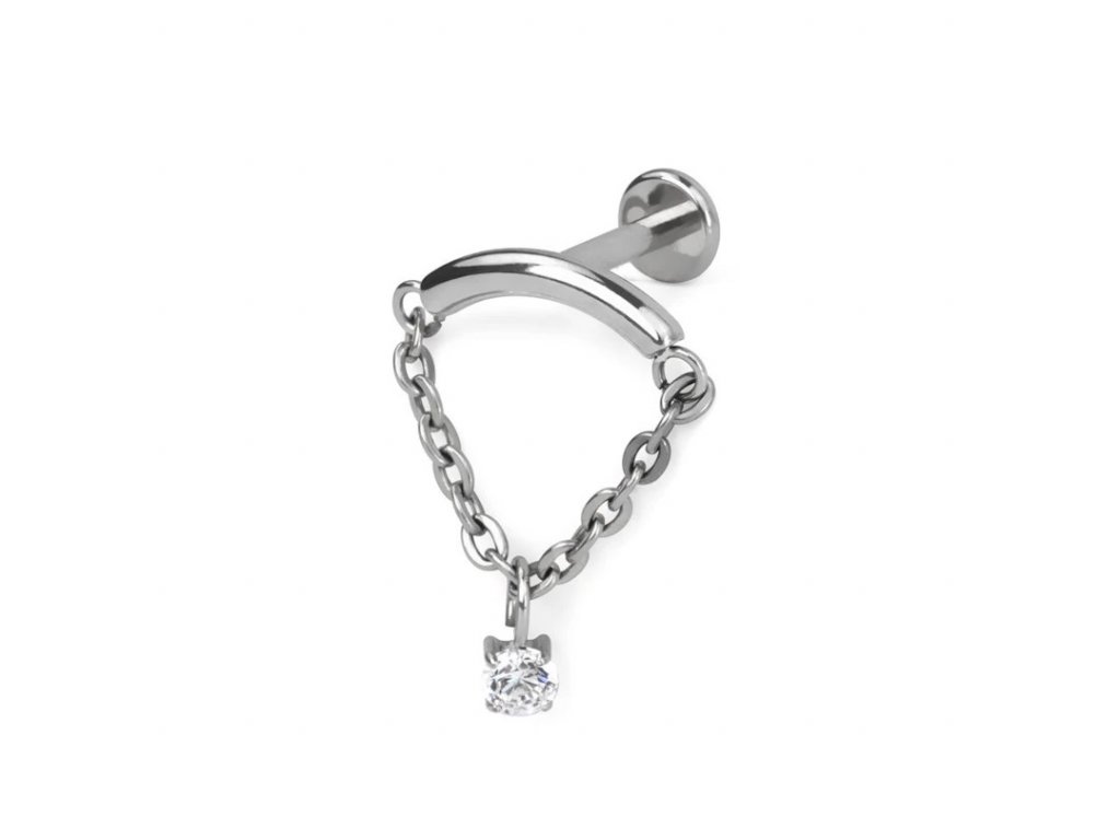 Elegantní titanová labreta s jemně zahnutou tyčinkou a řetízkem, který spojuje oba její konce. Na smyčce řetízku je zavěšen čirý zirkon. Díky tomu, že zirkon není umístěn přesně ve středu řetízku, se vždy usadí v nejnižším bodě, což tomuto šperku dodává různé vizuální efekty v závislosti na jeho orientaci v uchu. Labreta vypadá skvěle v lalůčku nebo helixu, ať už samostatně nebo jako součást mixu dalších šperků.